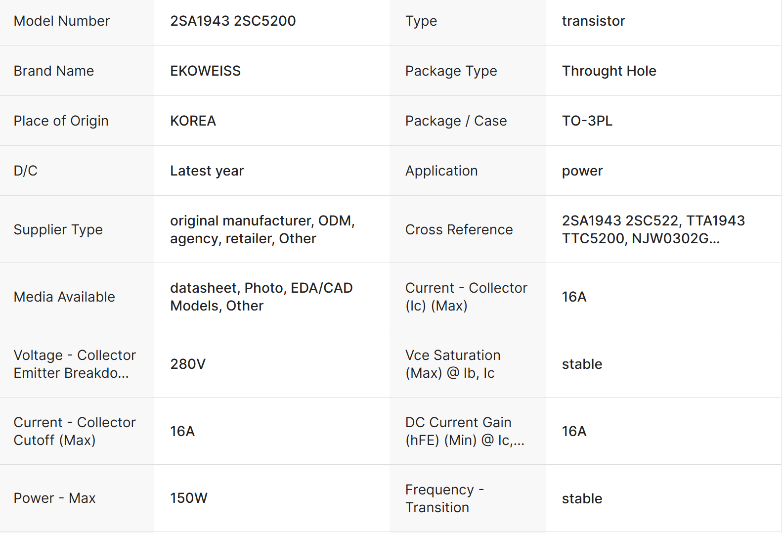 16A, 280V, 150W, TO-3PL Package (2SA1943 / 2SC5200)